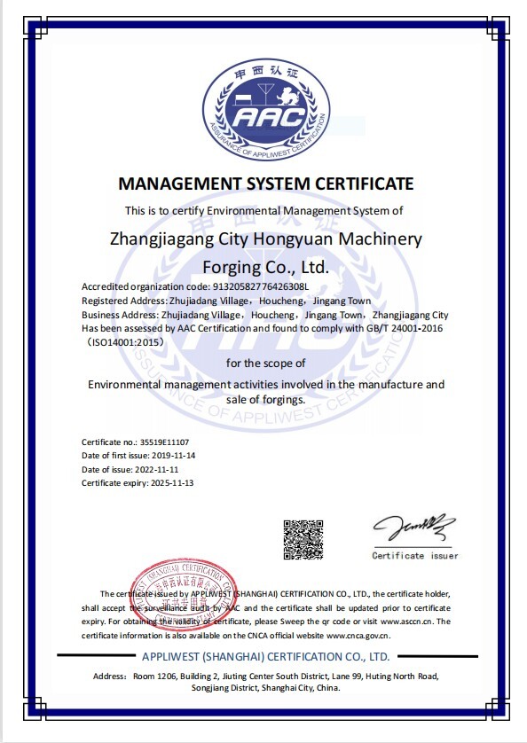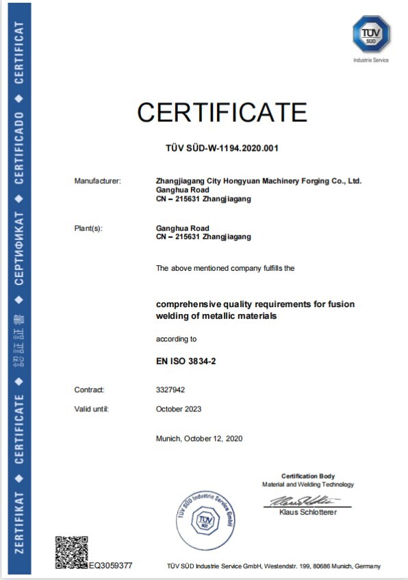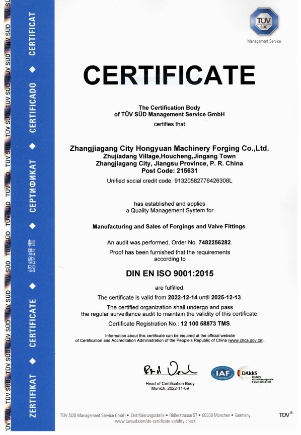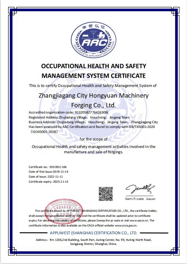 张家港市鸿源机械锻造目前已通过PED、ISO9001、ISO14001、ISO45001、ISO3834-2、Norsok M650和API 20B认证。自2022年起,我们还被评为中国本地高新技术企业。